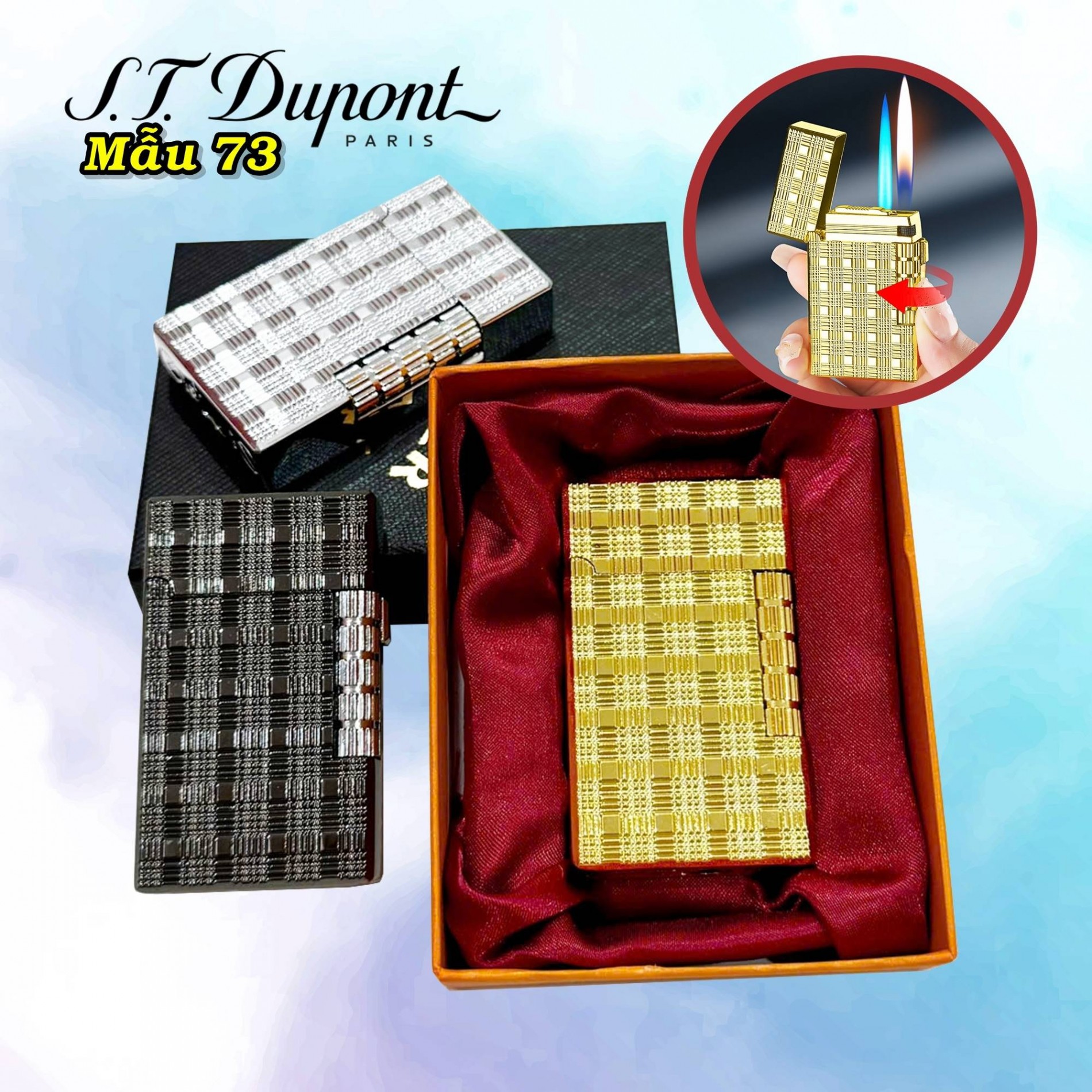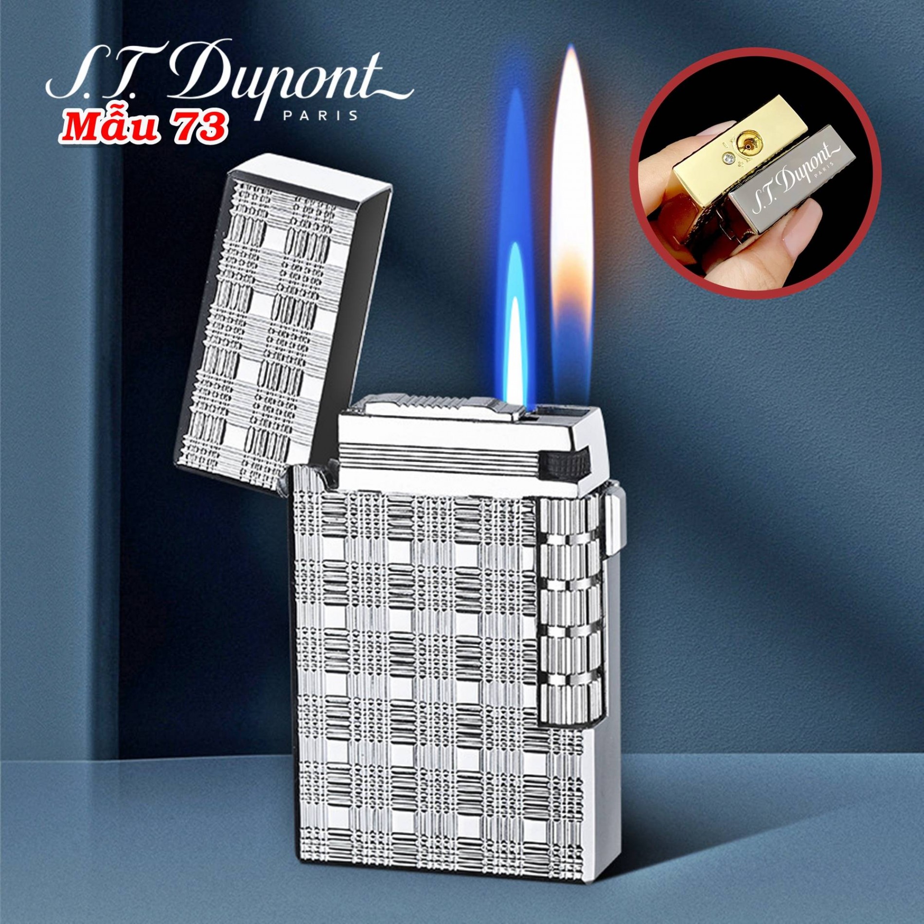 Bật lửa Dupont 2 chế độ lửa vân caro M-73 có hộp xài gas