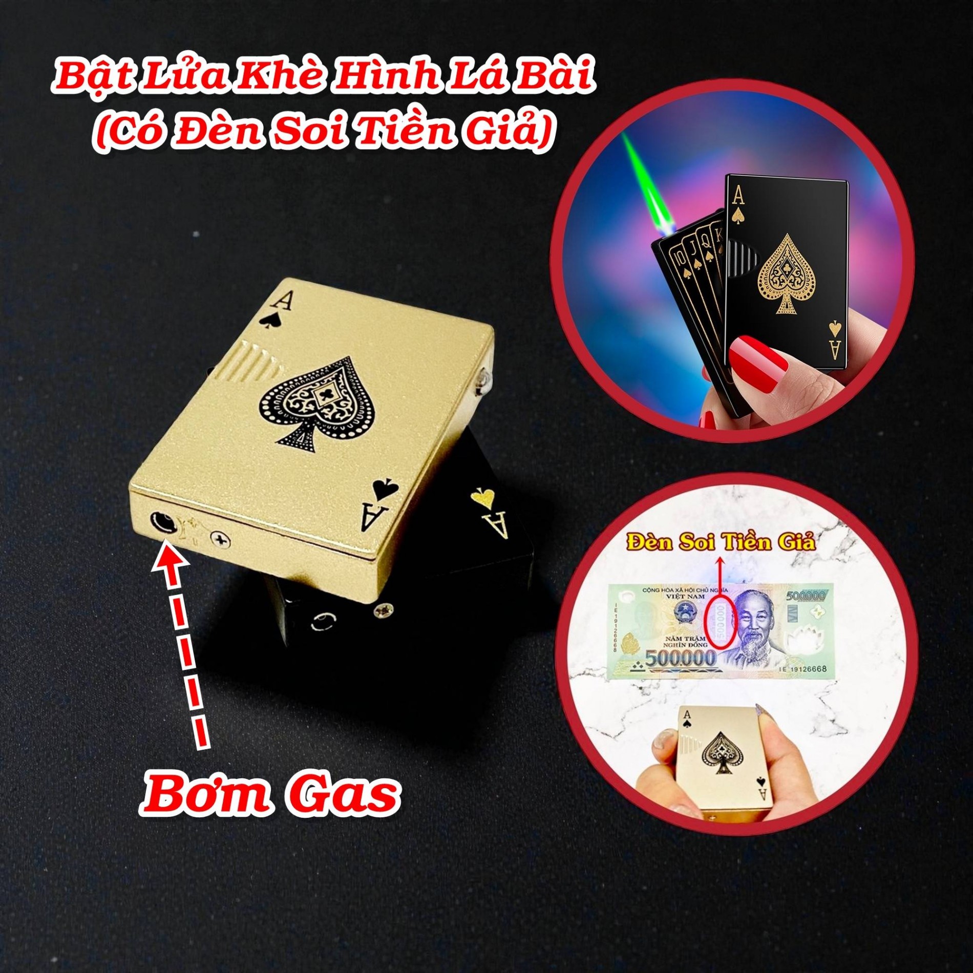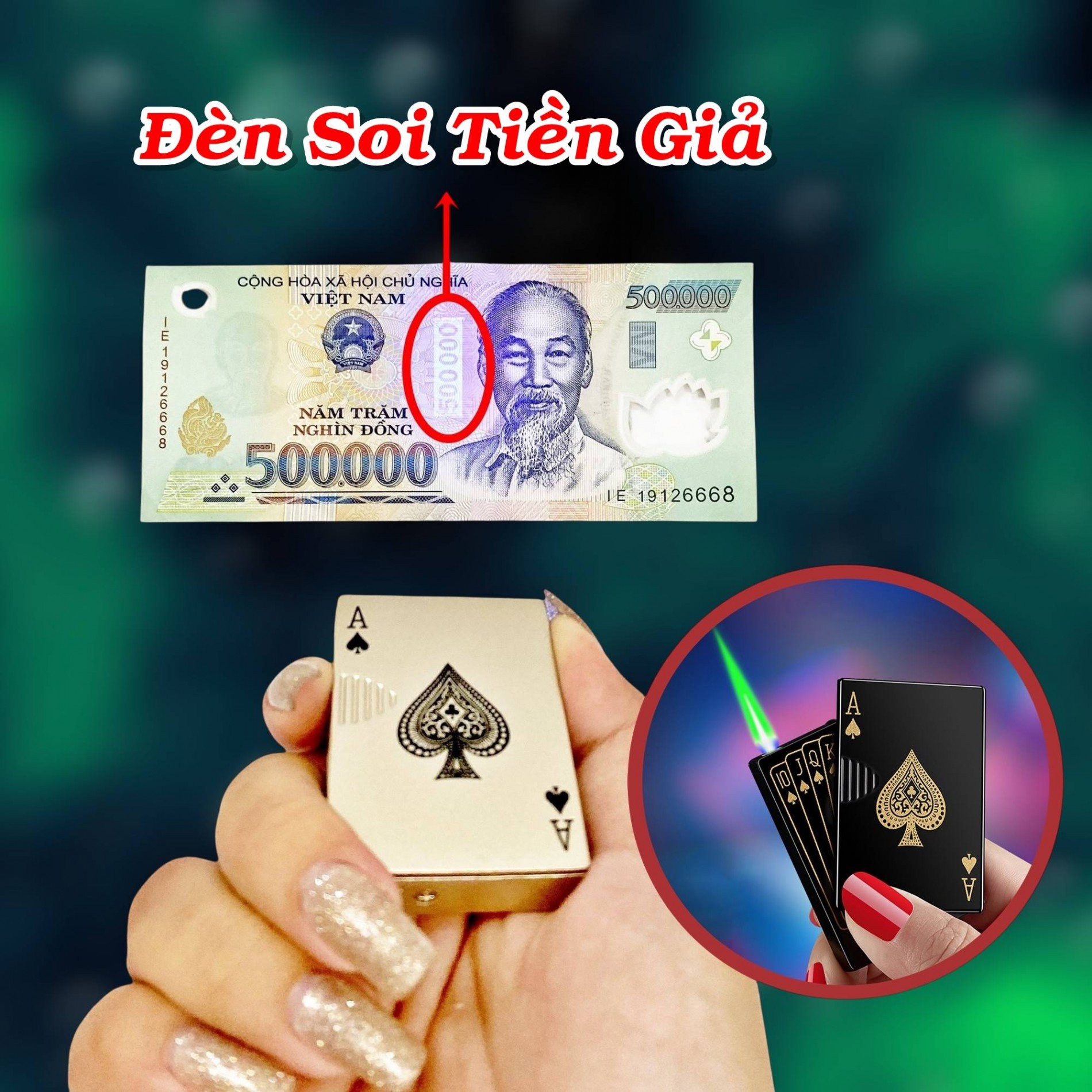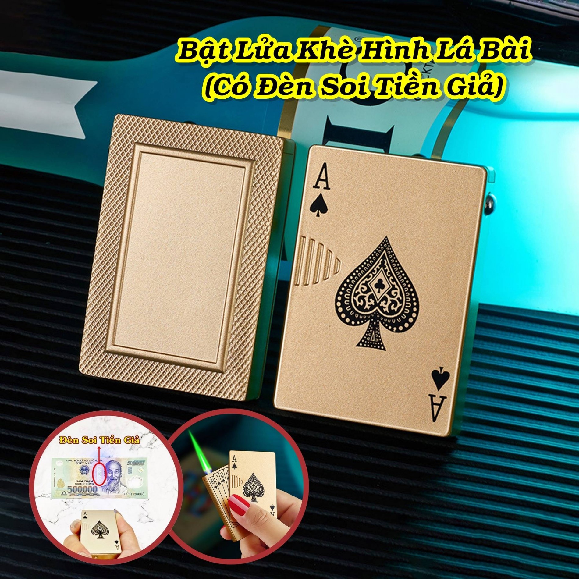 Bật lửa hình lá bài có đèn soi tiền giả xài gas màu vàng