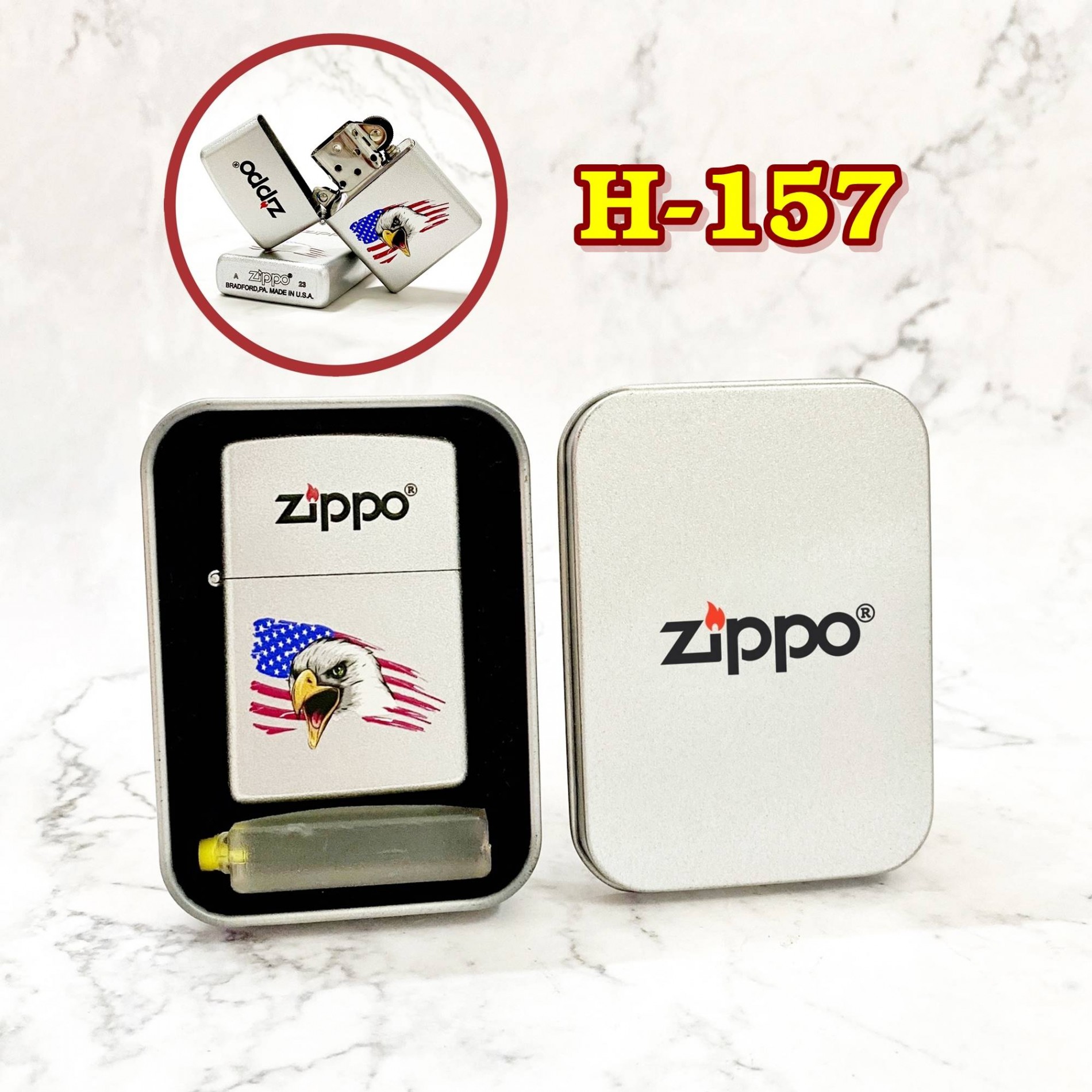 Bật lửa Zippo 2 mặt hình đại bàng cờ mỹ hộp thiếc kèm xăng